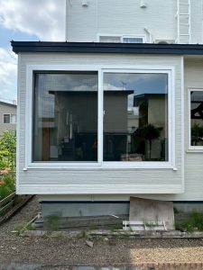 屋根からの落雪によって、窓サッシが破損している状態です。